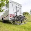 Dette sykkelstativet benytter de standard festene du allerede har bak på bobilen din. Et solid aluminiumsstativ som kan løfte opptil tre sykler, to er standard og den tredje kan tilkjøpes som opsjon. Stativet løfter hele 60kg slik at de fleste sykler løfter den uten problemer.